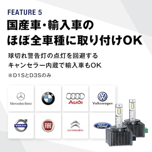 純正HIDバルブからの交換用LEDとして開発され、6000Kの純白ホワイト光が夜間の視認性を大幅に向上させます。
