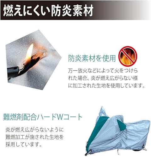 防水性能に加え、万一の火災に備えた防炎素材で作られている点もこのバイクカバーの大きな特徴です。
