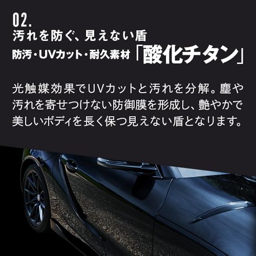 これにより、車の表面に強固な防御膜を形成します。 - 酸化チタンの光触媒効果:酸化チタンは汚れを分解する光触媒作用が知られており、水や光に反応しボディの汚れを抑制、簡単な洗車で美しさを保つ手助けをします。