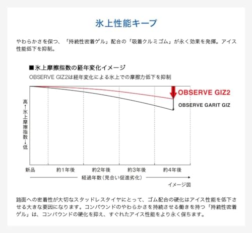 スタッドレスタイヤの多くは使用期間が限られがちですが、OBSERVE GIZ2はロングライフ設計により、性能低下を抑えつつ冬シーズンを通じて安定したパフォーマンスを発揮します。