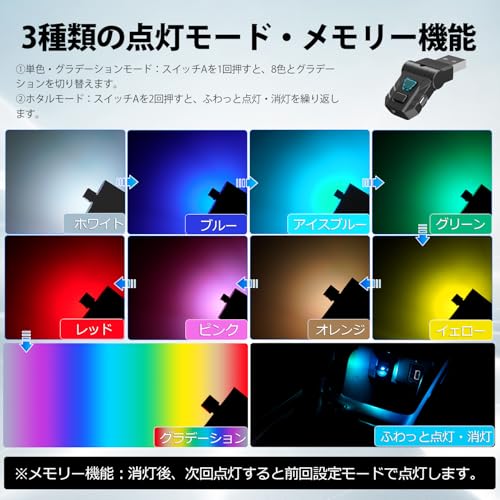 さらに、8色とグラデーション、ホタルモードなど多彩な点灯パターンも身近に楽しめるため、車内の雰囲気作りに役立ちます。