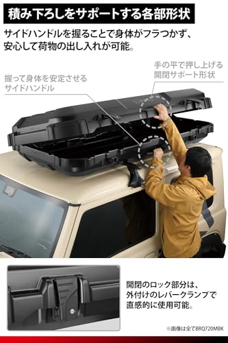 サイドハンドル付きで高いルーフでも開閉がしやすく、外付けバックルロックの採用により内部の積載スペースを広く確保できる設計です。