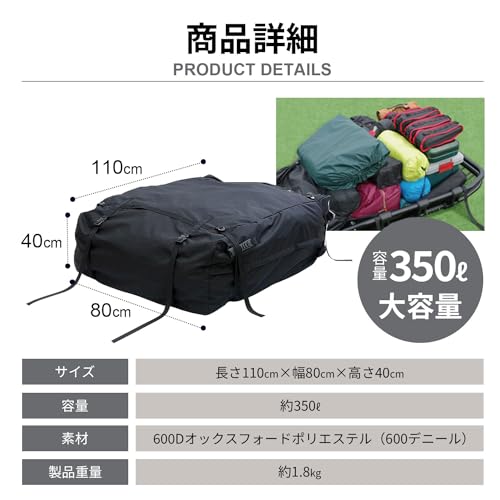 本製品は容量350リットルという大容量を誇り、防水・防塵性能と固定用バックルベルトによる安定性に優れています。
