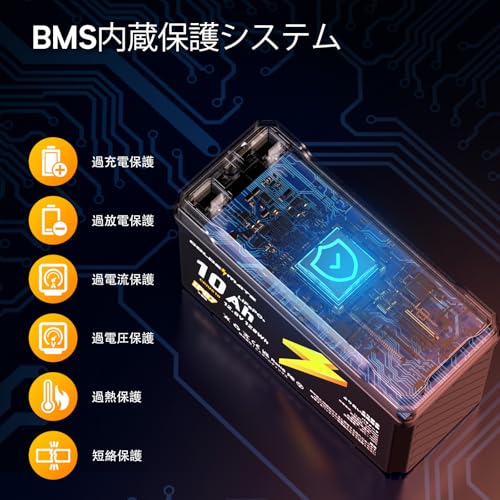 - 内蔵BMS(バッテリーマネジメントシステム):過充電・過放電・過電流・短絡から保護し、安全性を強化。