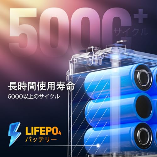 本製品はリン酸鉄リチウムイオンバッテリーを採用しており、5000回以上の充放電サイクルに耐えられる設計です。