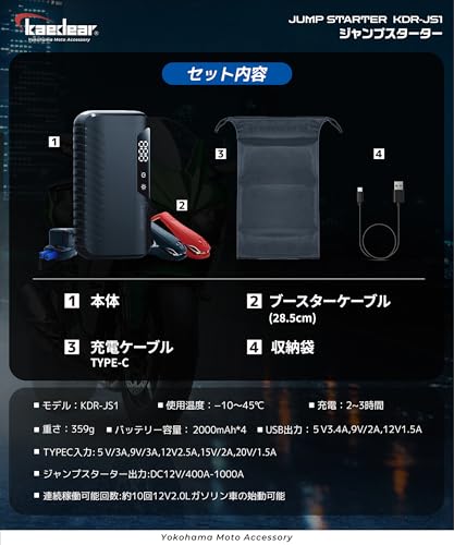 Kaedear(カエディア)のバイクジャンプスターター KDR-JS1は、12V車両に対応し、排気量~4000ccまでのバイクや乗用車での使用が可能な設計となっています。