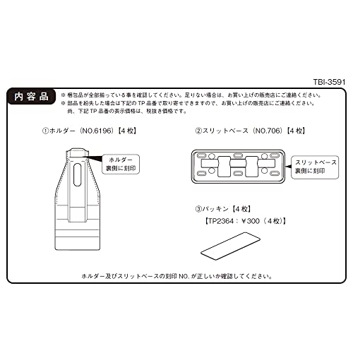 Terzoのホルダーセットはホルダー×4、スリットベース×4、取扱説明書×1がセットになっており、これらすべてが揃っているかチェックしてください。