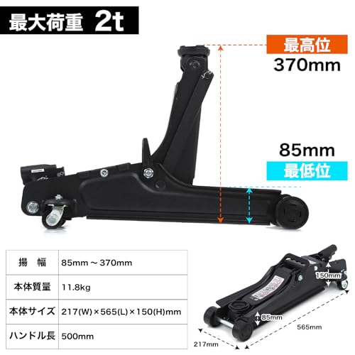 このジャッキは最大2トンの荷重に耐えられ、揚幅85mmから370mmまで対応しているため、軽自動車から普通車、さらにはミニバンまで幅広い車種に適しています。