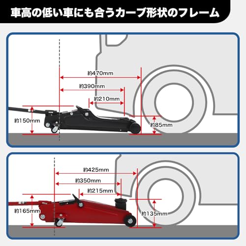 揚幅は85mmから370mmと低床設計なので、ローダウン車でもジャッキアップしやすい点が特長です。