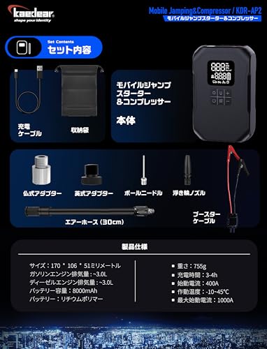 Kaedear(カエディア)のジャンプスターター&電動エアーポンプKDR-AP2は、8000mAhの大容量バッテリーを搭載し、充電性能と持続時間に優れています。