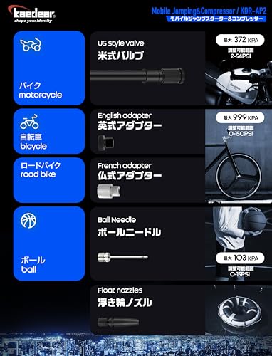 『KDR-AP2』は最大999KPAの吐出圧力と28L/分の吐出量で、バイク・車・自転車はもちろん、ボールや浮き輪などレジャー用品にも対応。