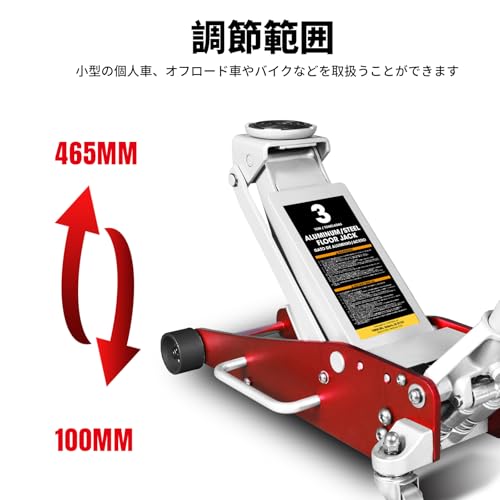 このジャッキは最低位100mm、最高位465mmのリフトレンジを持ち、ローダウン車でも無理なく対応できます。