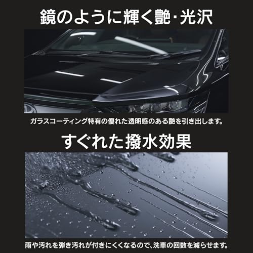 - ガラス質の被膜が洗車キズを埋め込み、ボディを滑らかに仕上げる