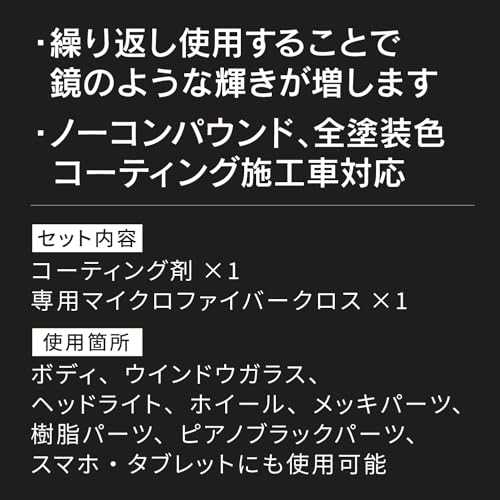- ガラス質の被膜が洗車キズを埋め込み、ボディを滑らかに仕上げる