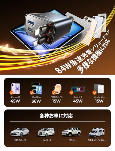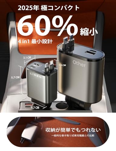 LISEN 4in1巻き取り式車載充電器は、コンパクトな設計と最大69Wの強力出力という両立が魅力で、急速充電を求めるユーザーに非常に適しています。