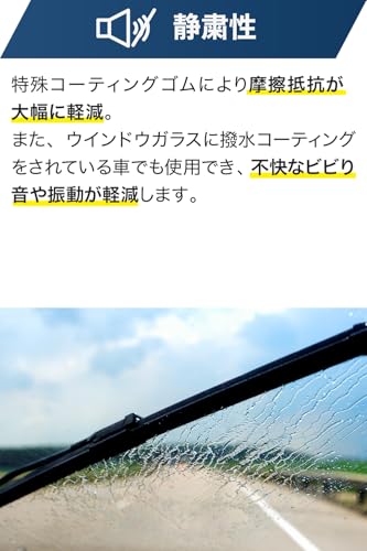 - メリット:撥水効果で雨滴を弾き視界良好、交換可能な替えゴムでコストパフォーマンス良好、静音設計で使用中の運転中の集中力向上