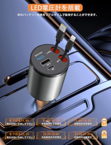 「VIKNAN シガーソケット 車充電器」は、Type-CとLightningの2種類の巻き取り内蔵ケーブルを備えています。