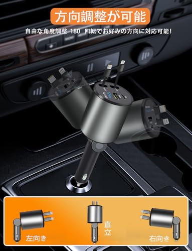 - メリット:巻き取り式ケーブルでコード絡まりを防ぐ、4台同時充電可能、12V/24V車対応、角度調整が自由、複数の安全保護搭載