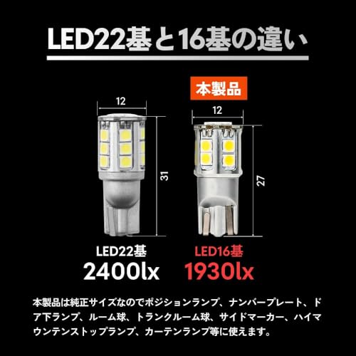 このLEDはポジションランプとしての夜間走行での視認性向上や、ナンバー灯による後続車への明確な識別、ルームランプの室内照明アップグレードとして活用できます。