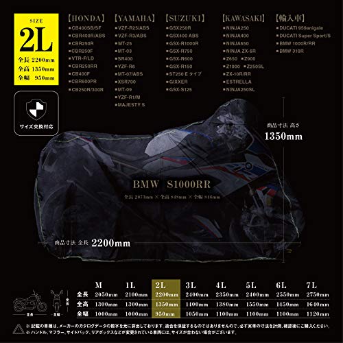 Barrichelloでは標準の8サイズとBOX付き車専用の3サイズを展開しており、全長220cm、高さ135cm、幅105cmの2Lサイズは中型から大型バイクに適したサイズです。