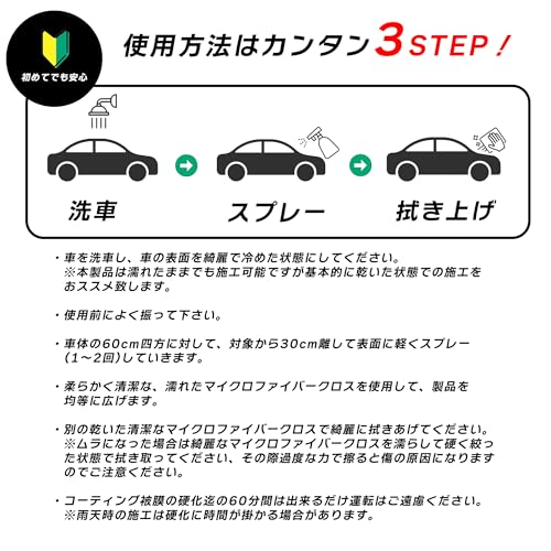 • 保管と耐久性:耐久期間は約3〜6か月ですが、車の使用状況や保管環境によって変動するため、定期的な再施工がおすすめです。