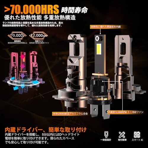 WAIXINGREN H7 LEDヘッドライトは、超爆光かつ高効率の7035LEDチップを搭載しながら、耐久性に優れた素材で作られているため、長寿命かつ安定した性能を期待できます。